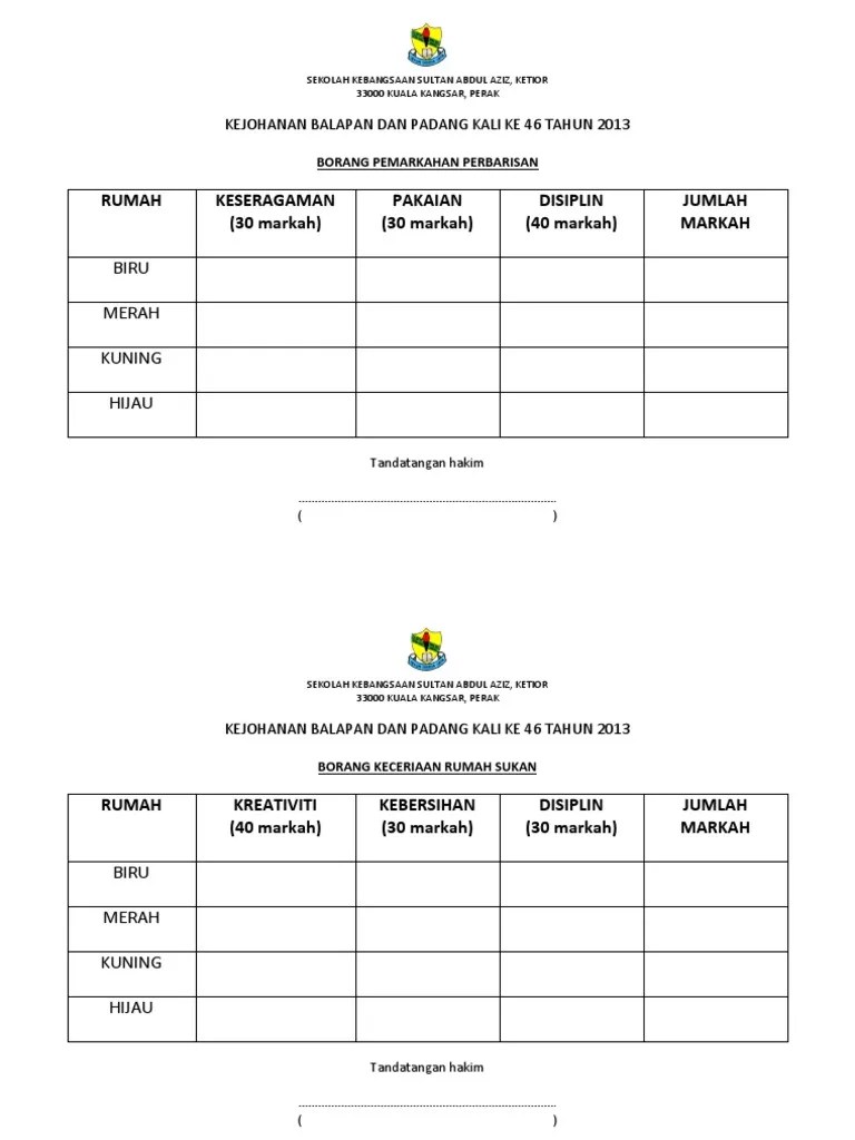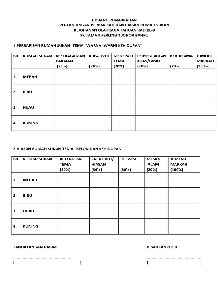 Borang pemarkahan pertandingan perbarisan antara rumah sukan sekolah kebangsaan pekan kota belud sabah. Borang pertandingan perbarisan rumah sukan. Hijau borang pemarkahan pertandingan hias khemah rumah sukan. Memastikan pemilihan atlit dan latihan sukan dilaksanakan. Perbarisan rumah delima untuk hari sukan sdm 2019.